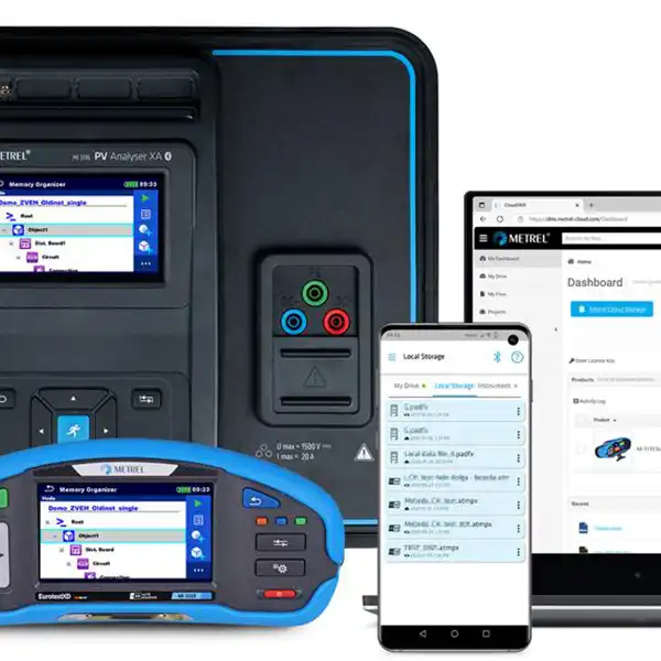 Die Metrel-Cloud-App bietet ein nahtloses Erlebnis und verbindet Ihre Metrel-Messgeräte mühelos über Bluetooth oder ein Wi-Fi-Netzwerk mit Ihrem mobilen Gerät. Die Verbindung kann über einen QR-Code hergestellt werden. Diese Erweiterung sorgt für ein reibungsloses und intuitives Benutzererlebnis und macht die Datenübertragung zum Metrel Cloud-Speicher zum Kinderspiel. Darüber hinaus können lokal gespeicherte Dateien einfach auf dem mobilen Gerät (z.B. Anroid oder Apple Smartphone) übertragen werden, wodurch Ihre Arbeitsablauf-Effizienz verbessert wird. Verfügbar für Android und iOS.